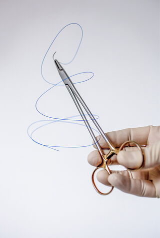 Der Schnitt am Hodensack wird z.B. mit einem Stich wieder genäht. Derselbe Vorgang erfolgt auf beiden Seiten.